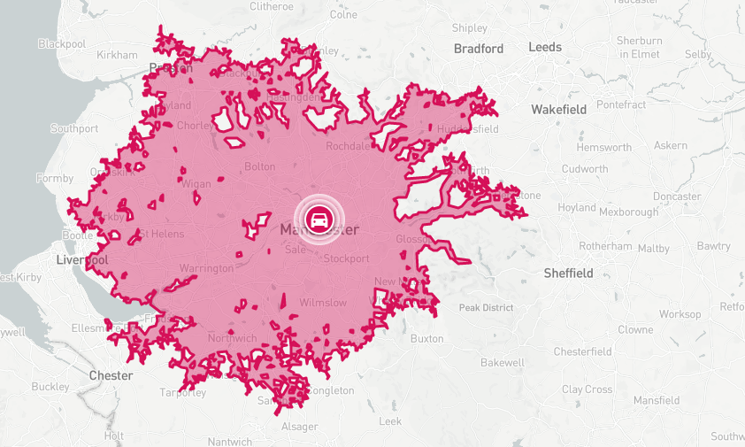 De derde iteratie op het tonen van de afhaalpunt gebieden is met een isochrone. Een isochrone is een 'lijn op een map die punten verbindt waarop iets gebeurd of arriveert op dezelfde tijd'. Met deze lijn kan in de transport wereld een gebied aangegeven worden dat je kan bereiken binnen in een bepaalde tijd en/of afstand.